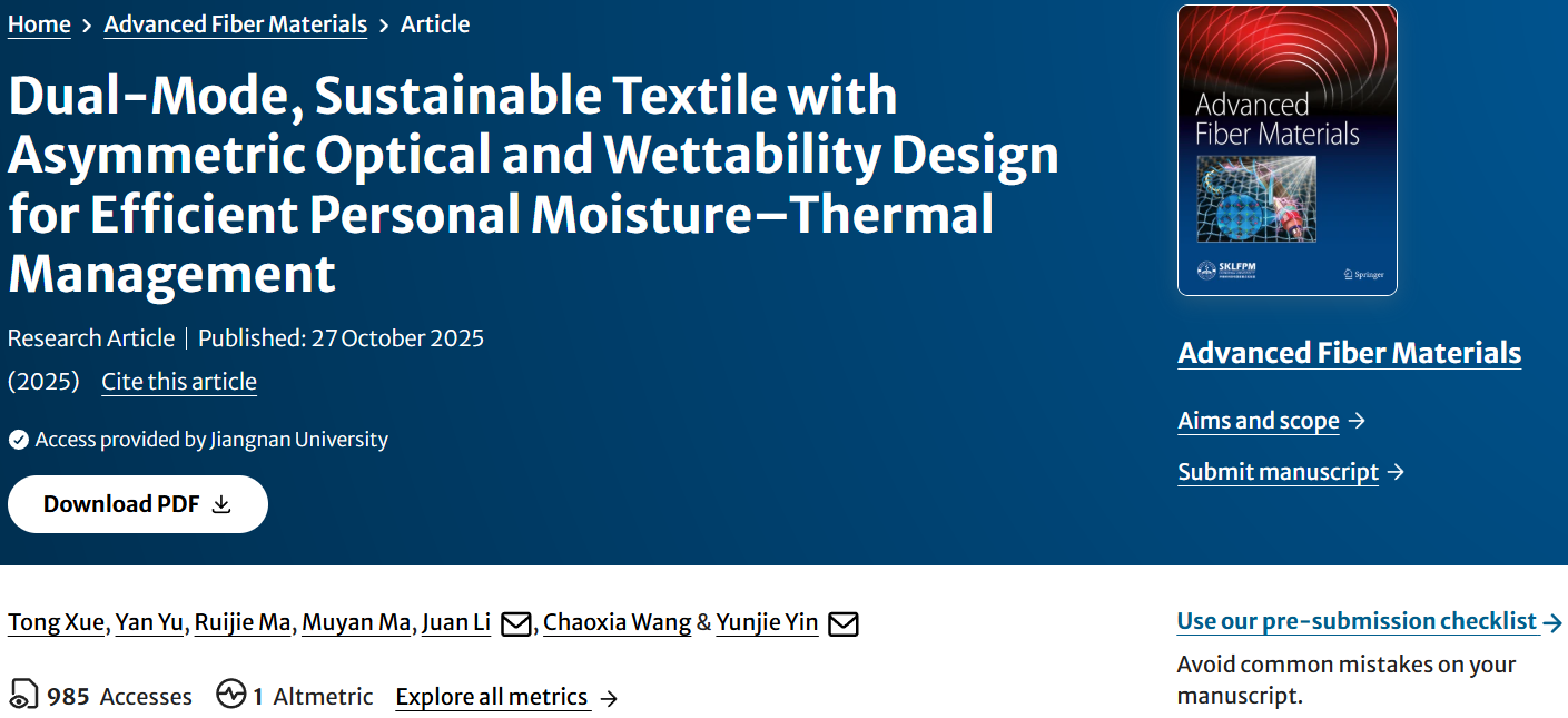 近日,我院智能纺织新材料研究室殷允杰教授在国际顶级期刊Advanced Fiber Materials上在线发表了题为“Dual-Mode, Sustainable Textile with Asymmetric Optical and Wettability Design for Efficient Personal Moisture-Thermal Management”的研究论文。该研究通过分层静电纺丝技术,制备了一种具有不对称光学性能、润湿性和孔径分布的双模式聚乳酸基个人热管理纺织品(DMTex),用于高效的个人湿热管理。独特的光学结构设计和功能颗粒的添加使DMTex具有优异的光学性能。三层结构设计赋予DMTex优异的单向导湿和防反渗性能。同时,DMTex还具有良好的耐磨性、生物相容性和可降解性。这种双模且可持续的DMTex在实现高效的个人湿-热舒适性方面展现出巨大潜力。吞精视频