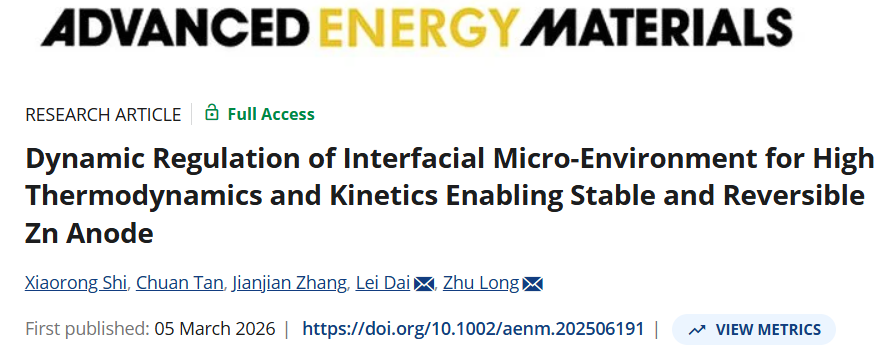 近日,我院短纤维功能材料研究室龙柱教授团队在水系锌离子电池领域取得了重要研究进展,研究成果以“Dynamic Regulation of Interfacial Micro-Environment for High Thermodynamics and Kinetics Enabling Stable and Reversible Zn Anode”为题在线发表在《Advanced Energy Materials》(IF=26,中科院大类一区TOP期刊)上,论文第一作者为我院博士研究生史肖蓉,通讯作者为龙柱教授和戴磊教授,吞精视频