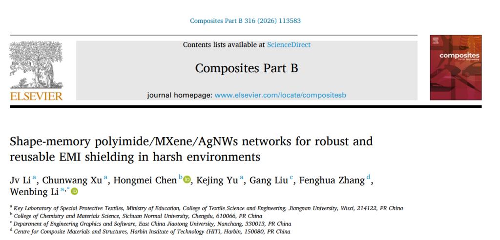 近日,我院先进纤维与纺织复合材料研究团队在复合材料领域顶级期刊《Composites Part B: Engineering》(IF=14.2)上发表题为“Shape-memory polyimide/MXene/AgNWs networks for robust and reusable EMI shielding in harsh environments”的研究论文。该研究提出了一种基于形状记忆聚酰亚胺(PI)的梯度导电网络构建策略,通过将二维MXene和一维银纳米线(AgNWs)组装到静电纺PI纤维基底上,成功制备了具有“静态屏蔽”到“动态适应”转变能力的柔性电磁屏蔽复合薄膜。该研究为开发适用于复杂形变和严苛环境的新一代电子防护材料提供了创新思路。吞精视频