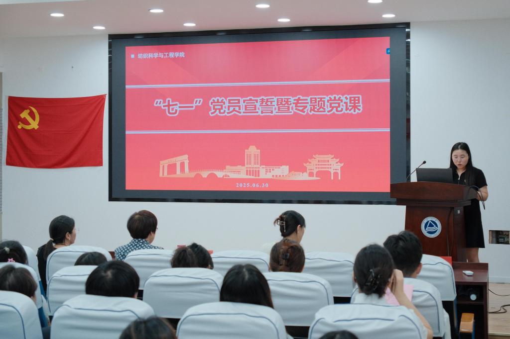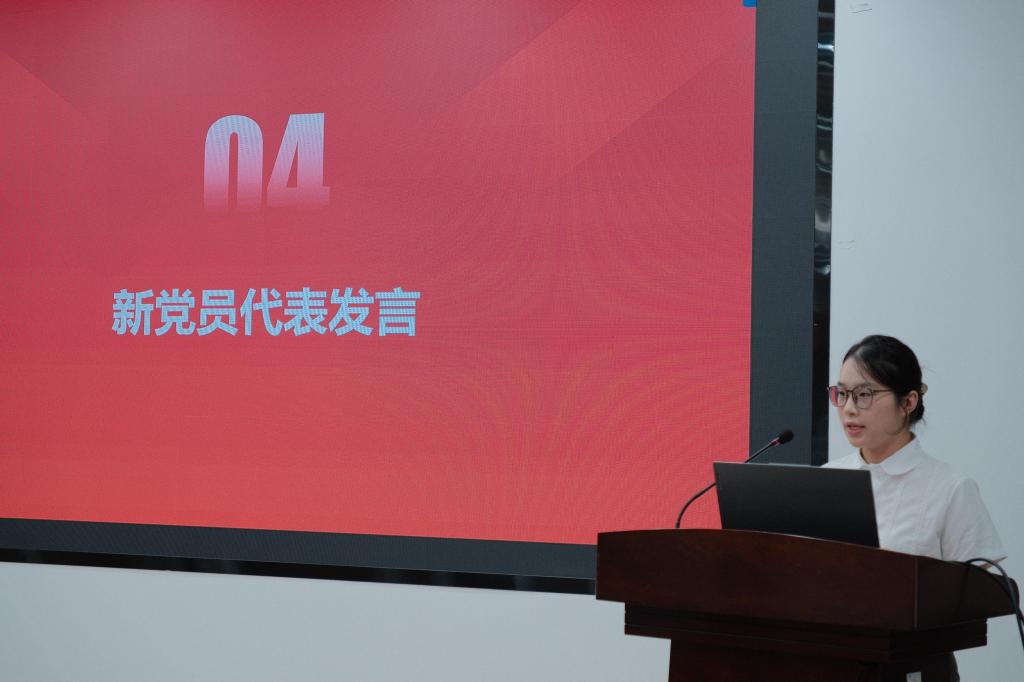 纺织2206班黄沁雯同志代表新生党员发言。她结合自身经历分享入党初心,并代表全体新发展党员庄严承诺:践行先锋使命,切实发挥“一名党员一面旗帜”的先锋模范作用,锤炼专业能力,掌握服务国家纺织产业发展的过硬本领,勇担时代重任,用实际行动书写“强国有我”的青春誓言。