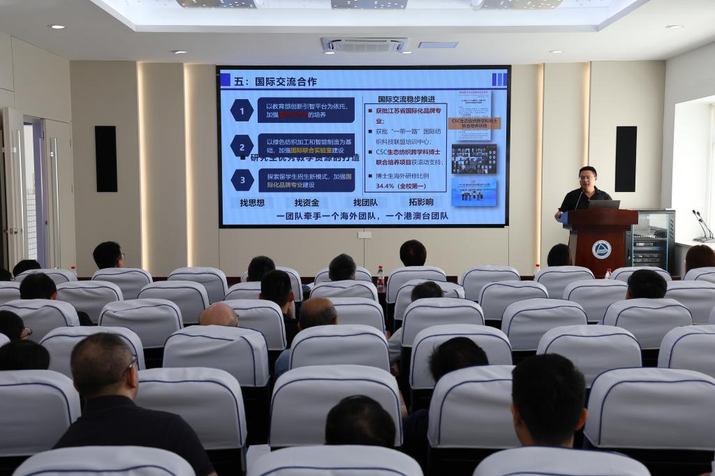 付少海作学院“十五五”规划(2026-2030)起草工作报告。他围绕学院“纺织学科‘十五五’规划”,总结了学院的任期目标完成情况,深入剖析了目前学院在学科平台建设、科研成果、人才引进等方面存在的问题与挑战,并结合“十五五”发展规划背景,提出学院“十五五” 期间的总体发展目标——建成“研究型、国际有影响力、特色鲜明优势凸显”的纺织学科,并从三大维度部署具体举措:一是要围绕国家战略,凝聚学科方向。打造军工特色、智能织造技术、生态加工技术的核心学科方向;二是要坚持四个面向,开展学科研究。以平台为引领,优化科研团队,强化特色建设;三是加强师资队伍建设,优化人才培养机制。注重高水平师资队伍建设,深化高素质人才培养改革,构建“纺织+创新拔尖本科生人才培养体系”与“多维度研究生人才培养模式”,为纺织产业高质量发展输送人才。