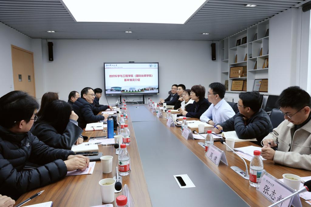 (国际丝绸学院),学院党委书记苏淼、院长于斌携班子成员参加了座谈交流会。双方分别介绍了各自办学特色、学科优势与发展思路,围绕党建与事业发展深度融合、专业建设、课程改革、成果转化、青年教师发展等内容开展务实交流。双方坦诚沟通、深入探讨,就新时代纺织学科建设与人才培养等方面形成了广泛共识。