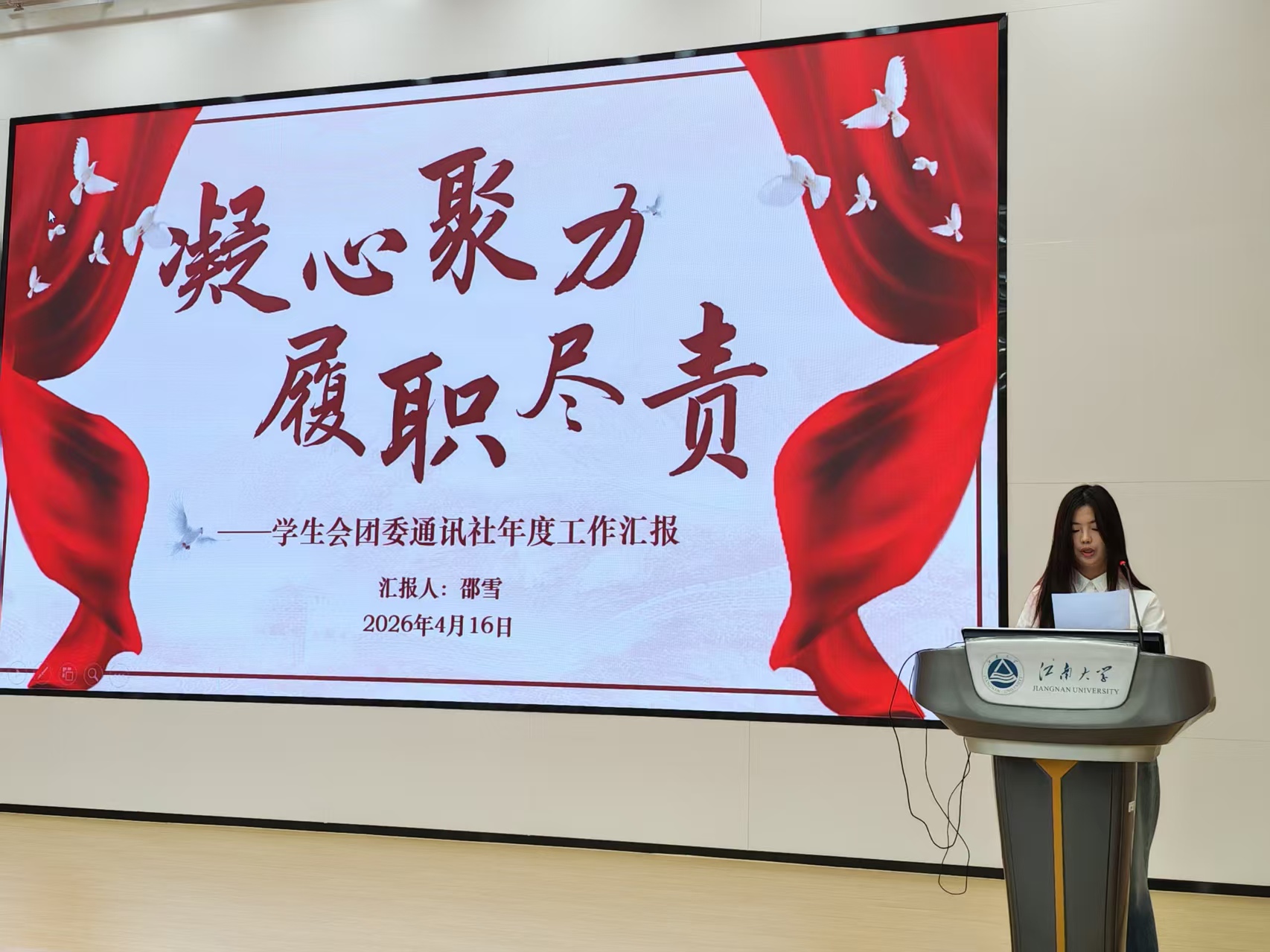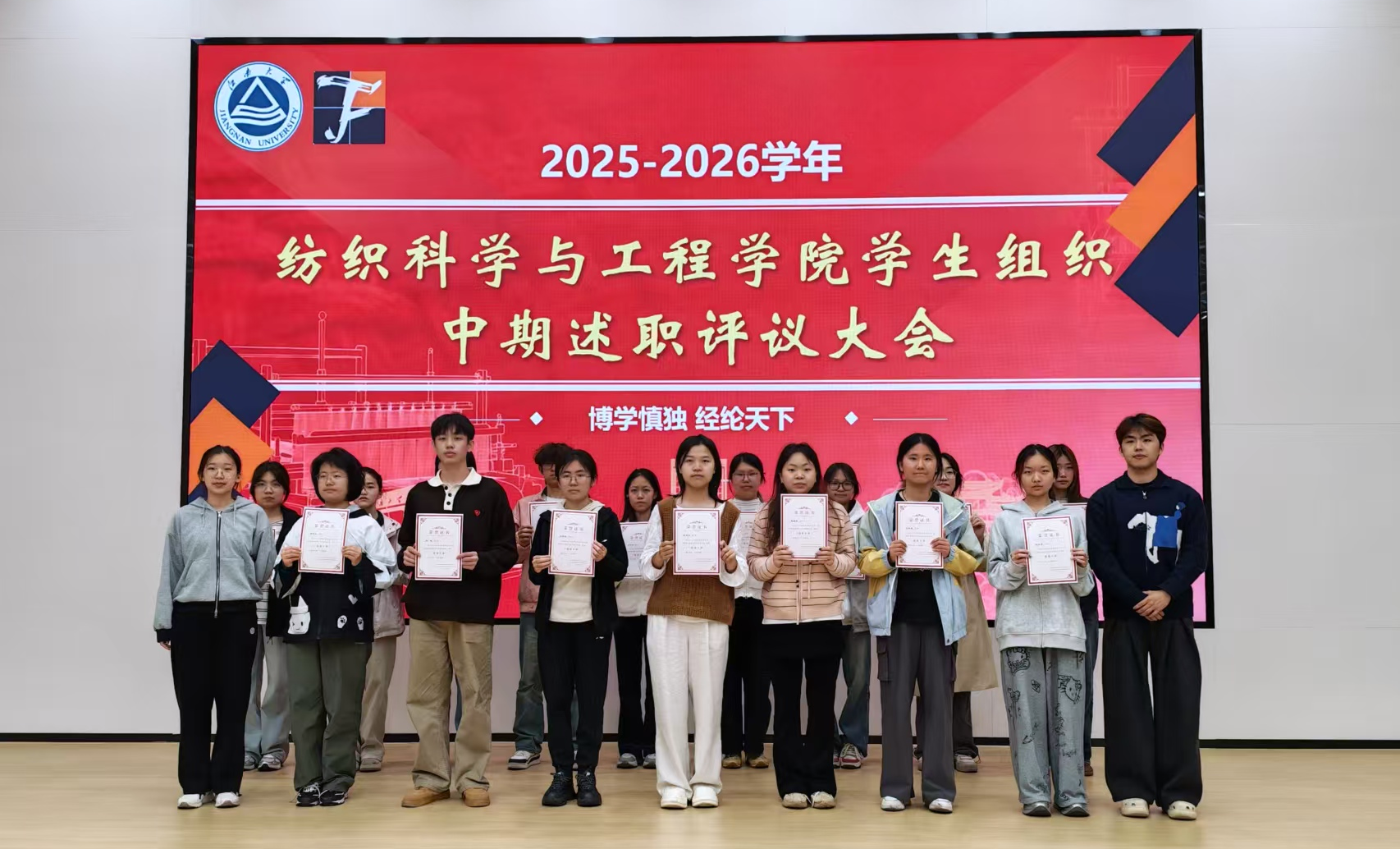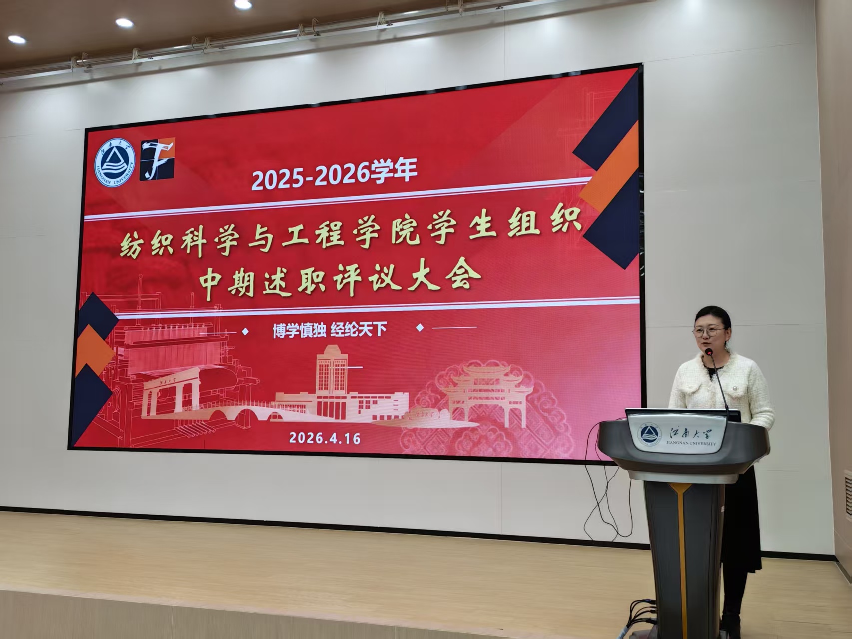 任老师对全体学生的工作态度与述职表现给予充分肯定,并对各部门述职内容进行集中点评。她指出,过去一年中,“经纬无界”晚会等品牌活动特色鲜明,“织光者”形象深入人心,融媒体栏目别具匠心,学风建设扎实推进,各项成果充分彰显了纺院学子的创造力与凝聚力。她强调,下一阶段各学生组织应进一步强化品牌活动的示范引领效应,持续深化实践服务,着力提升工作的精准性与实效性。同时勉励全体学生骨干继续保持昂扬姿态,锐意进取,携手谱写学院学生工作高质量发展的崭新篇章。